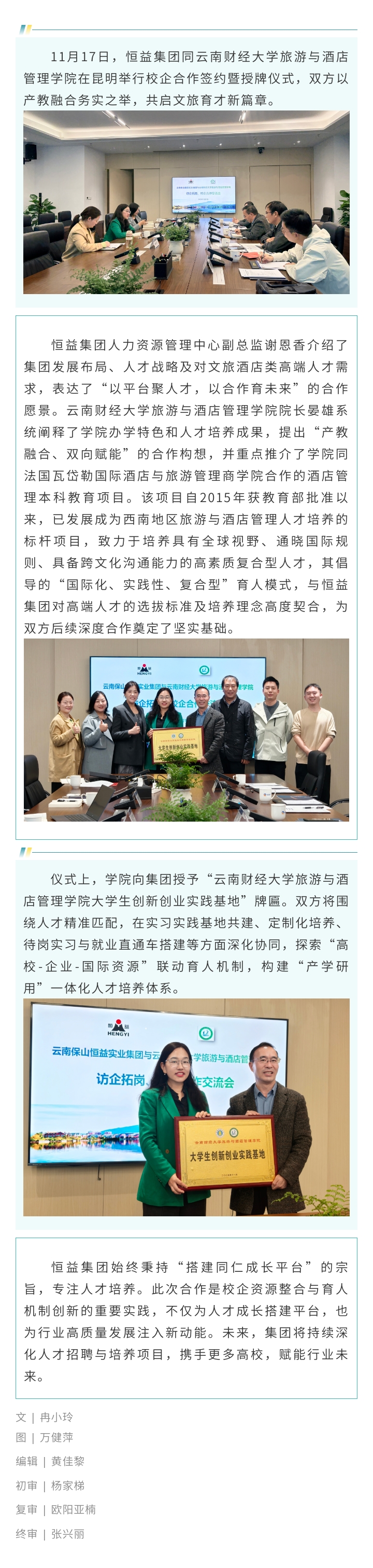 恒益集团与云南财经大学签约授牌 共启文旅育才新篇章 来源: 浏览量:450 日期:2025-11-18 分享到: 上一篇:恒益集团与大理大学共建实践基地 开启产教融合新篇章 下一篇:恒益集团“薪火计划3.0”视频创意大赛公开评审圆满落幕 以创意赋能产品传播