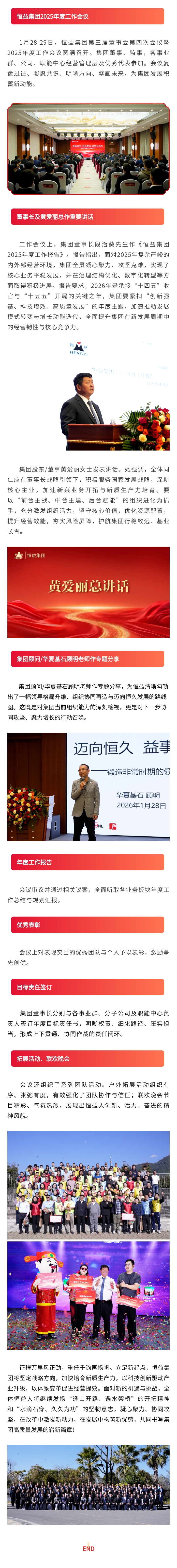 创新强基固根本 科技增效启新程——恒益集团组织召开第三届董事会第四次会议暨2025年度工作会议 来源: 浏览量:457 日期:2026-01-29 分享到: 上一篇:聚力谋发展,赋能启新程——腾冲市中药材协会2025年度座谈会顺利召开 下一篇:芸草书香里的文脉传承——记《芸草合编》古籍点校赠诗雅事