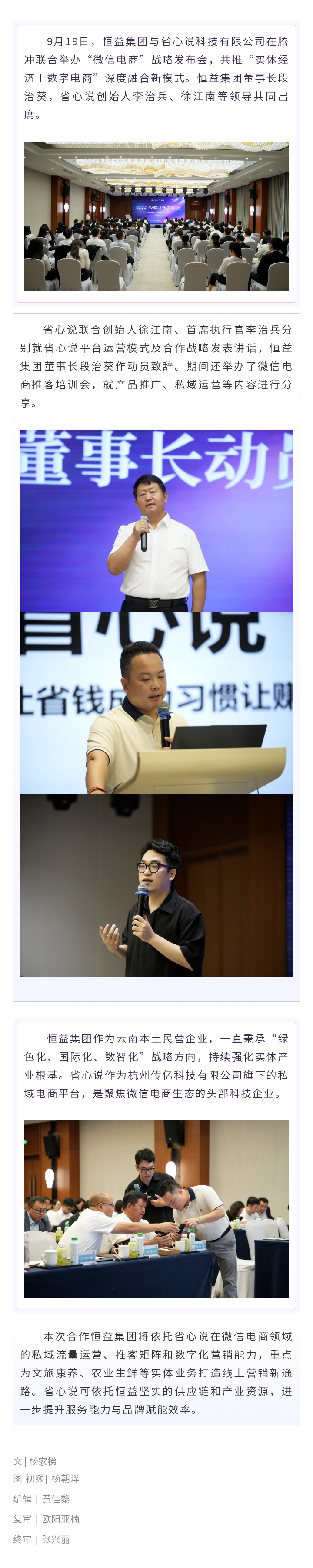 恒益集团与省心说科技达成合作 共筑微信电商新生态 来源: 浏览量:511 日期:2025-09-19 分享到: 上一篇:荣登双榜!恒益集团荣获2025云南民企百强第30位、服务业20强第8位 下一篇:喜讯丨恒益集团荣膺2025年“腾冲市教育事业高质量发展先进集体”称号