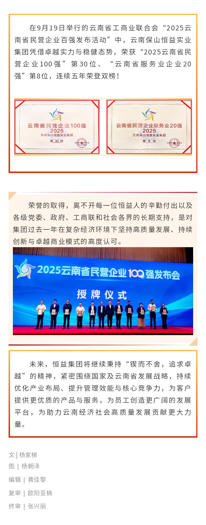 荣登双榜!恒益集团荣获2025云南民企百强第30位、服务业20强第8位 来源: 浏览量:537 日期:2025-09-19 分享到: 上一篇:恒益集团开展高管刑事法律风险防范与合规体系建设专项培训 下一篇:恒益集团与省心说科技达成合作 共筑微信电商新生态