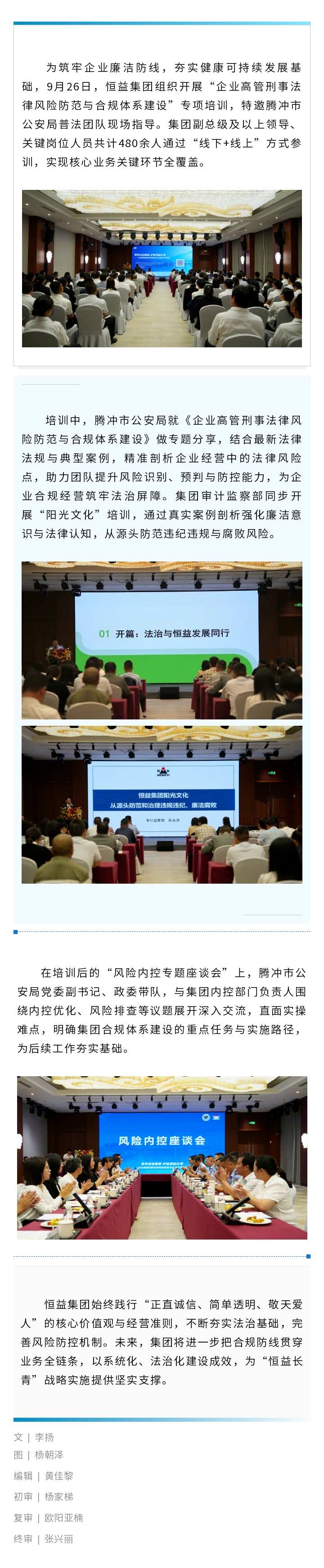 恒益集团开展高管刑事法律风险防范与合规体系建设专项培训 来源: 浏览量:373 日期:2025-09-28 分享到: 上一篇:没有了 下一篇:荣登双榜!恒益集团荣获2025云南民企百强第30位、服务业20强第8位